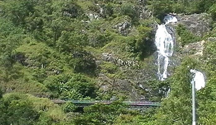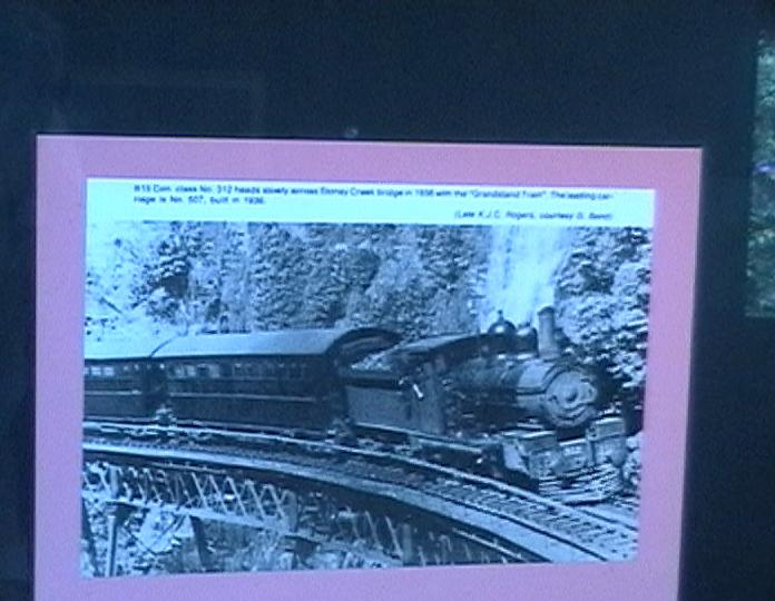 One of the old steam trains going past the waterfall part way up the track.